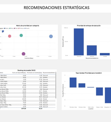 El proyecto implementa un flujo integral de inteligencia de decisiones que abarca desde la limpieza y estandarización de datos hasta la construcción de tableros ejecutivos y un manual estratégico. Incluye ingeniería de variables, modelado de riesgos de inventario, lógica de transferencias, estimación de recuperación de desperdicios y un motor de recomendaciones para apoyar decisiones críticas.