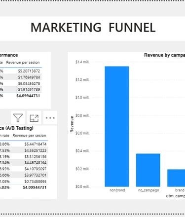 También se simuló un A/B testing comparando contenido de campañas (utm_content), se aplicaron técnicas de time intelligence para evaluar tendencias mensuales.