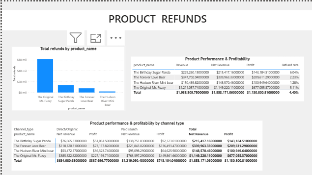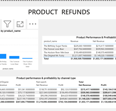 En cuanto a productos, el Original Mr Fuzzy domina en ingresos, aunque con un alto impacto de reembolsos, mientras que el Birthday Sugar Panda se posiciona como el más rentable.