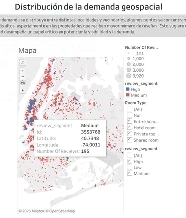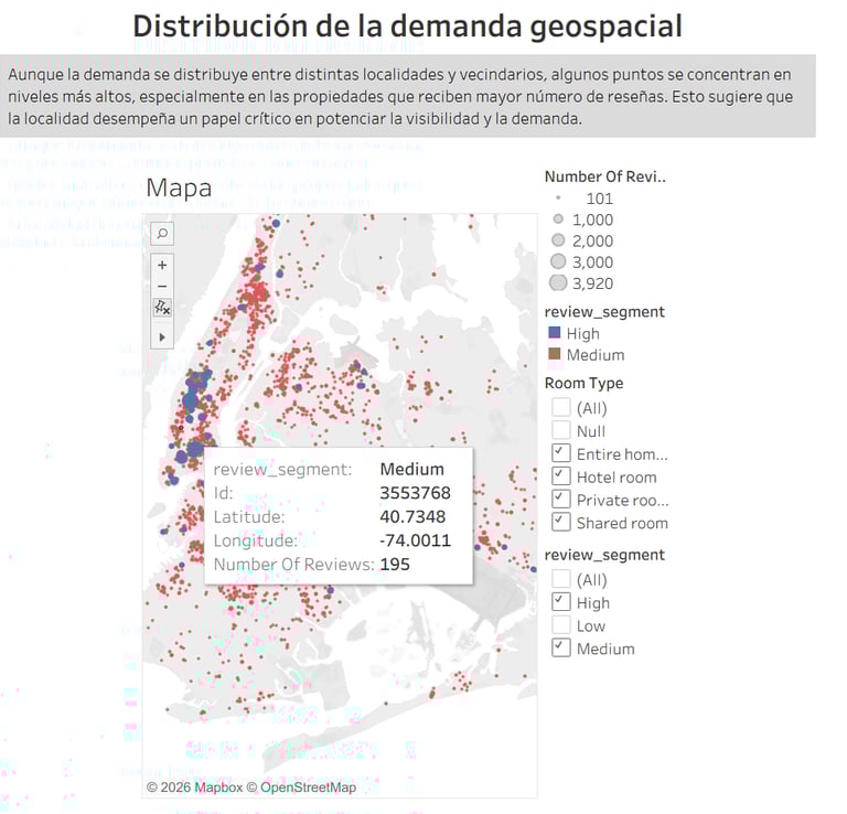 Se identificó la distribución geográfica de la demanda y se efectuó una segmentación por volumen de reseñas.