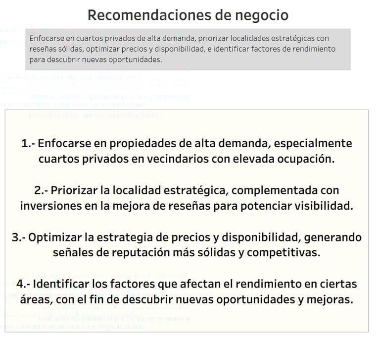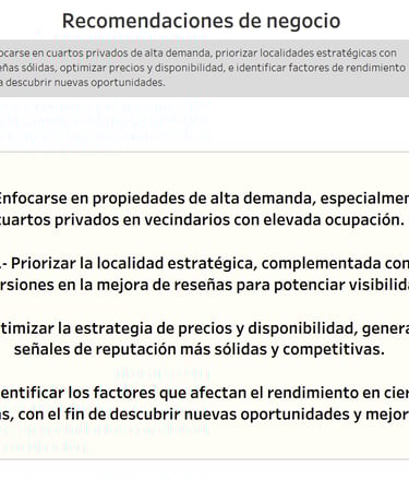 Las recomendaciones propuestas —optimizar la oferta de cuartos privados, invertir en vecindarios de alta demanda, ajustar precios según percepción de valor y diseñar estrategias diferenciadas para distintos segmentos de huéspedes— permiten traducir los insights en acciones concretas para mejorar la retención, maximizar ingresos y fortalecer la competitividad en el mercado.