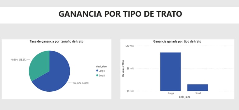 Se evaluó el desempeño del equipo de ventas y el impacto del tamaño de los acuerdos (pequeños vs grandes) en la rentabilidad.
