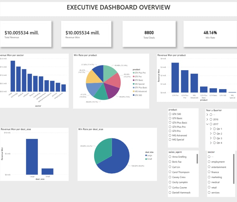 Este proyecto demuestra un workflow completo de analítica end-to-end aplicado a datos de ventas en CRM, transformando la información bruta del pipeline en insights de negocio significativos. A través de limpieza de datos, modelado, análisis exploratorio y desarrollo de dashboards, se obtuvo una comprensión integral del desempeño comercial, la dinámica de productos y la efectividad del equipo de ventas.