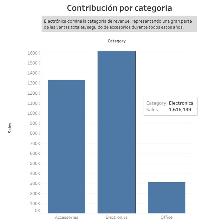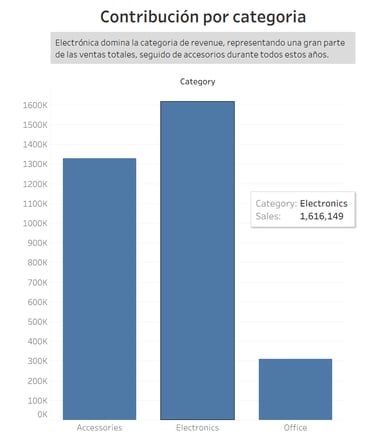 El análisis incluyó diversas visualizaciones clave en Tableau. Se desarrollaron gráficos de ventas por categoría, para identificar qué segmentos generan más revenue