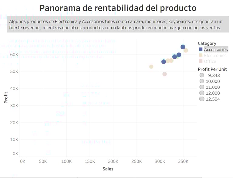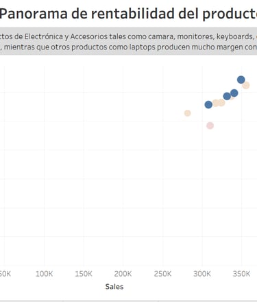 un scatter plot de ventas vs profit, que permite distinguir productos rentables de los no rentables
