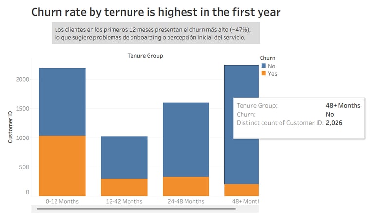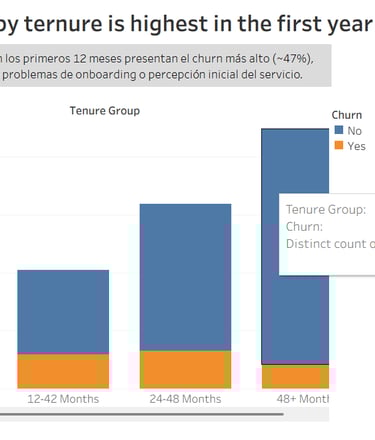 Se observó que las tasas de churn son considerablemente más elevadas durante los primeros 12 meses del ciclo de vida del cliente, lo que sugiere que la experiencia inicial y el proceso de onboarding son factores críticos.