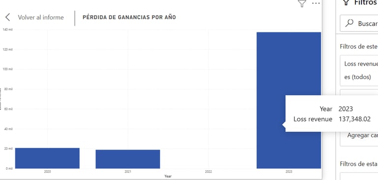 Las ventas netas pasaron de 759,040 a 421,800, lo que representa una disminución del 44%. Además, se registró un ingreso perdido de 137,349, un impacto crítico que no existía en el año anterior.