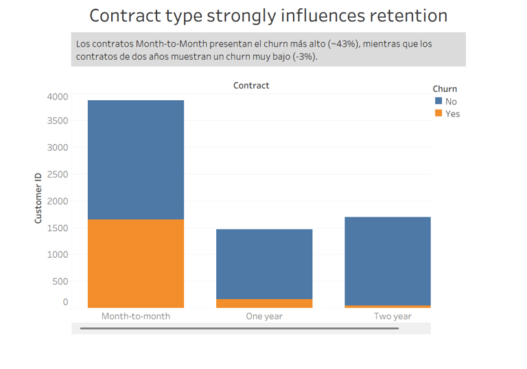 Los clientes con contratos mes a mes presentaron tasas de churn significativamente más altas en comparación con aquellos con contratos de largo plazo.