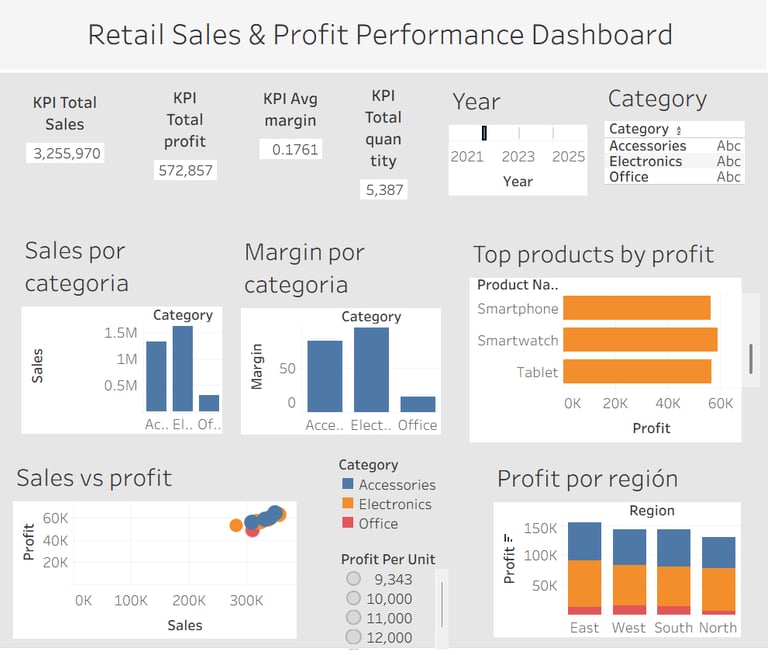 Un ranking de productos top por ventas. Además, se construyó un dashboard ejecutivo con KPIs principales (Total Sales, Total Profit, Average Sales y Number of Orders), acompañado de visualizaciones de desempeño por categoría, relación ventas–profit, performance regional y performance por producto.